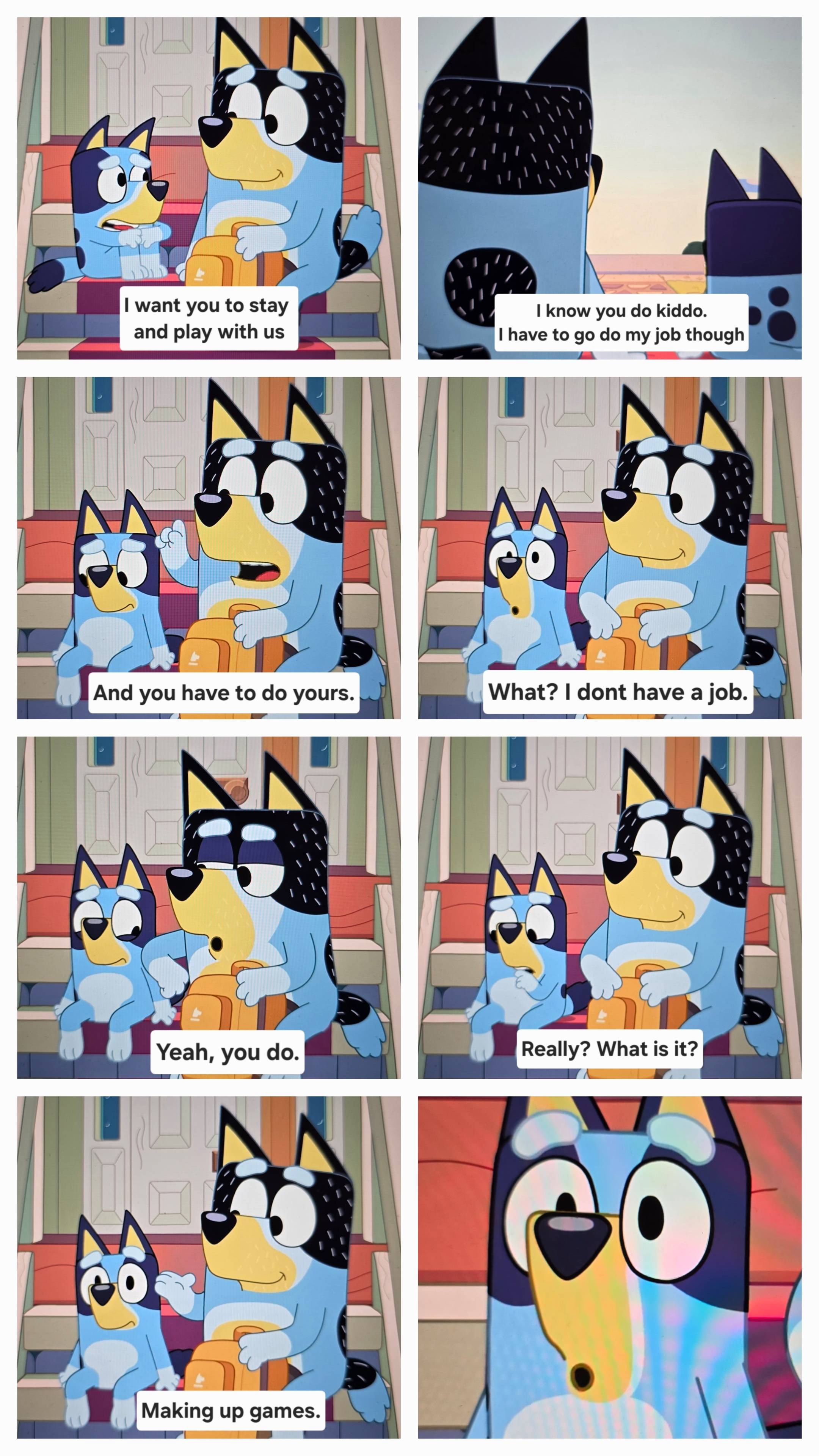 On Thursday morning, I sat with my daughter watching the little Aussie dog family, when an interaction between Bluey and Dad got to the heart of it.